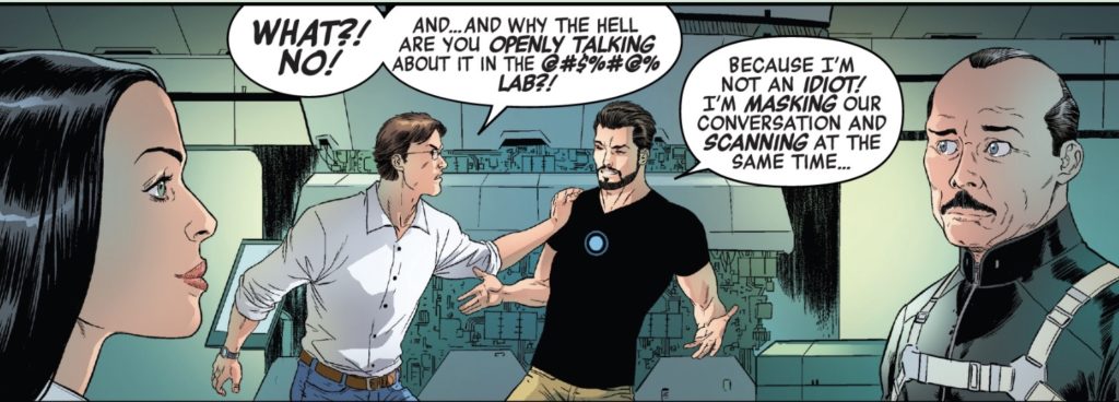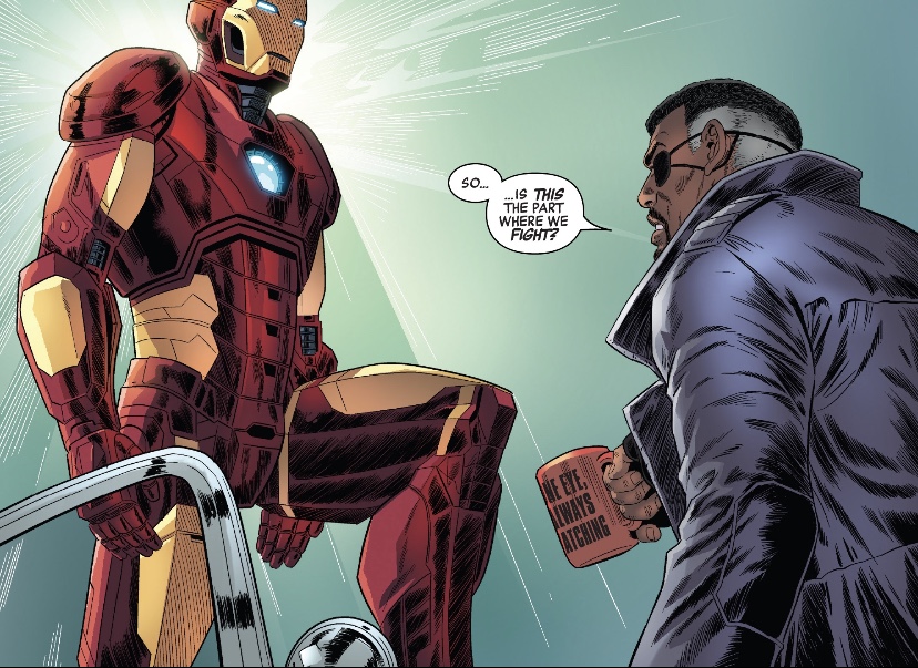 So, spoiler alert, it turns out that Spymaster was the one stealing Tony’s software. That’s because S.H.I.E.L.D. was secretly scanning Iron Man, Fury noting that he and the Avengers possessed too much power for there not to be contingencies.