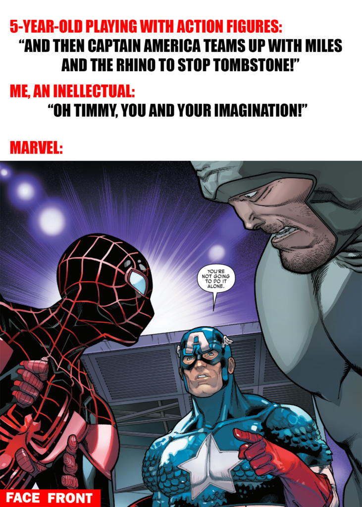 Y’all reading that new Miles Morales? Yeah, so TL;DR, Miles’s girlfriend’s cousin got roped into a ‘mind controlled kids’ operation that also happened to rope in Rhino’s niece. So Rhino and Miles teamed up to stop it only to find out that Tombstone was behind it! When they couldn’t figure out how to work together properly, Tombstone got away, but none other than… Captain America… showed up to help save the day…