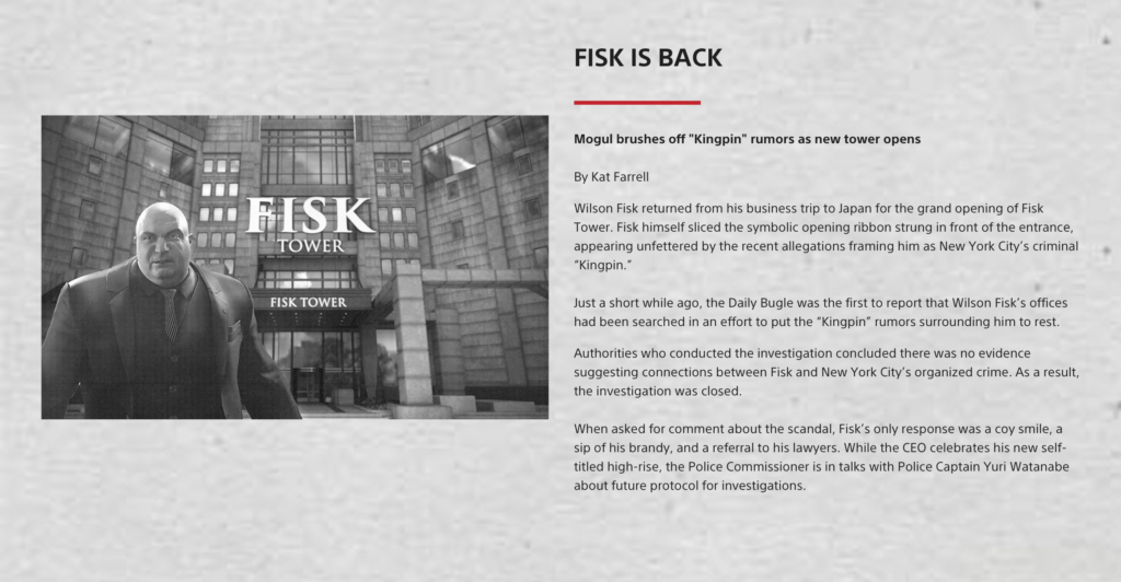-When Advanced looks up Wilson Fisk, he finds a newspaper article that says he’s back out of prison! This article was actually on the official website for the PS4 game!