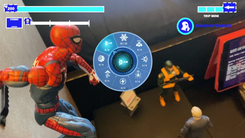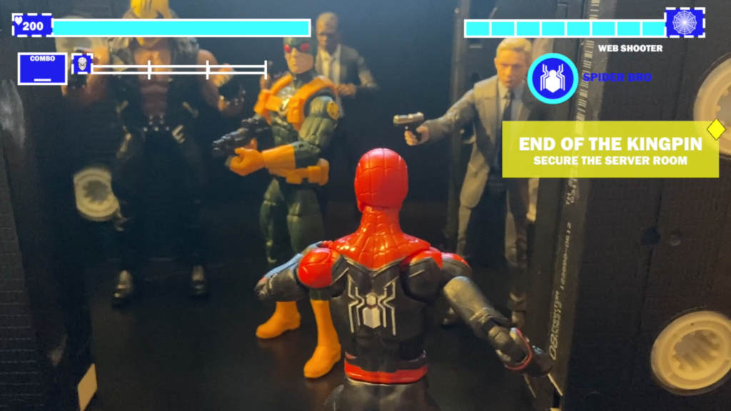 I also wanted to display the two main mission types from the game, stealth and combat. I knew immediately I needed an HUD, which I created from scratch. Monitoring health and web gadgets was a vital part of playing the game, and I really wanted to make sure it came across here!